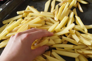 Dann werden die Pommes für etwa 30 Minuten in den Ofen gestellt, das hängt aber immer von der Dicke der Pommes ab. Also vor dem Rausnehmen immer einmal probieren!